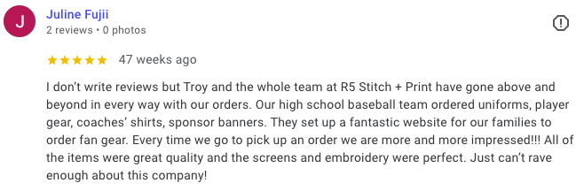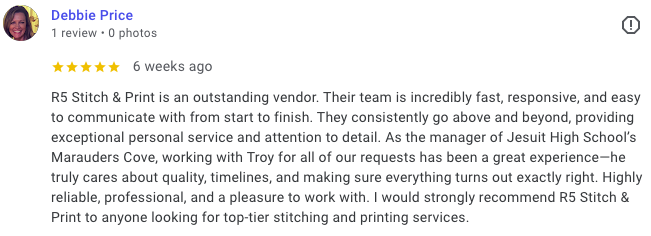 R5 Stitch + Print focuses on understanding our customers and delivering custom solutions that fit their needs. From screen printing and embroidery to laser engraving, digital printing, vinyl cutting, and sign and graphic printing, we help businesses and organizations bring their ideas to life.